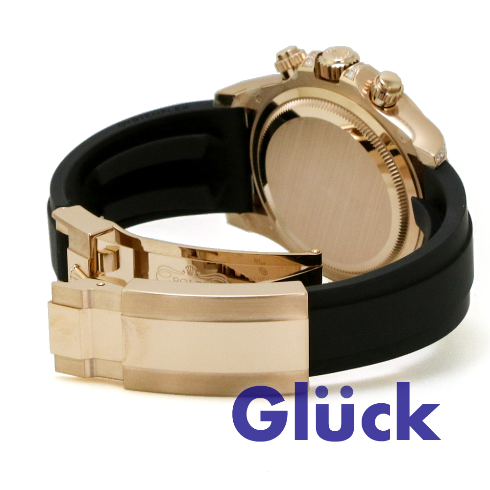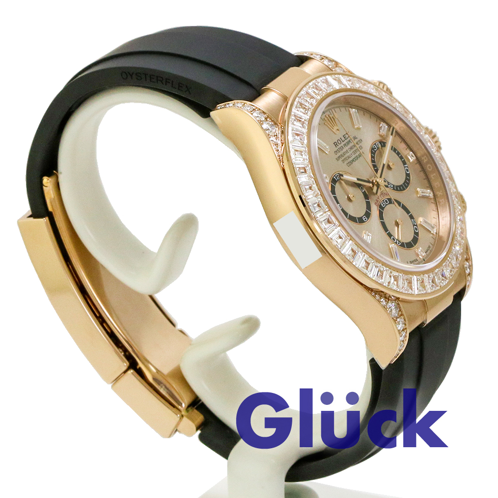 18 ct エバーローズゴールド製オイスター パーペチュアルコスモグラフ デイトナは、サンダストカラーにダイヤモンド入りダイアルとコントラストが際立つカウンター外周リングを備える、オイスターフレックスブレスレットとダイヤモンド入りベゼル、ダイヤモンドがセットされたラグが特徴的な時計です。