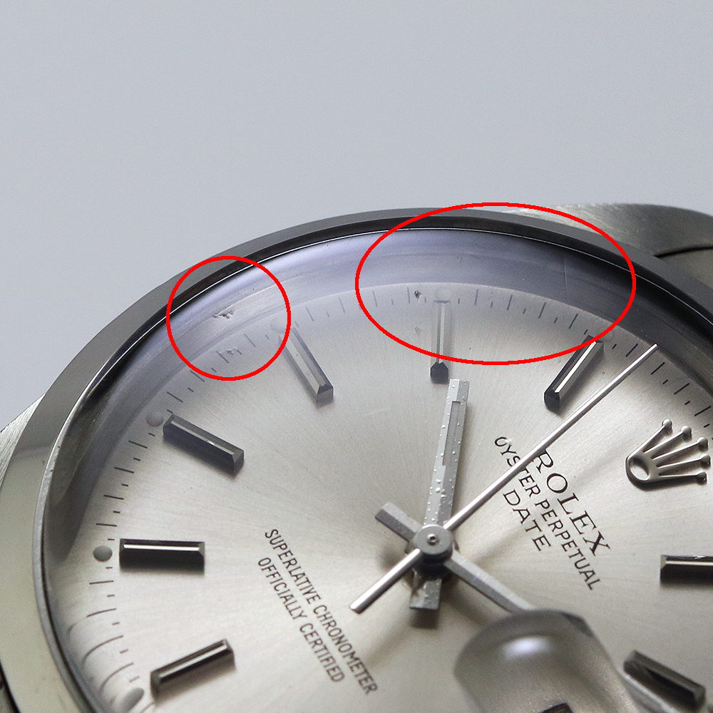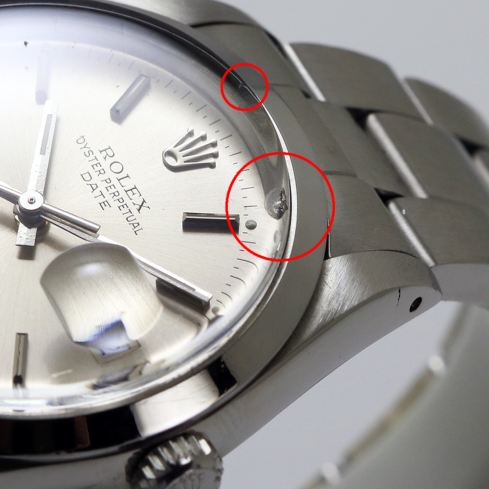 風防にキズ、全体的に使用に伴うキズや打痕、インデックスや針に経年変化が見られます。