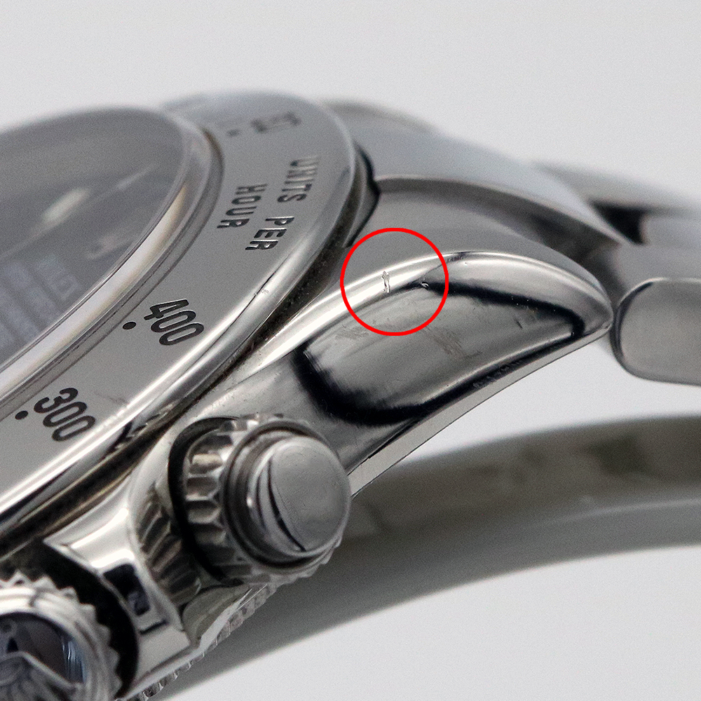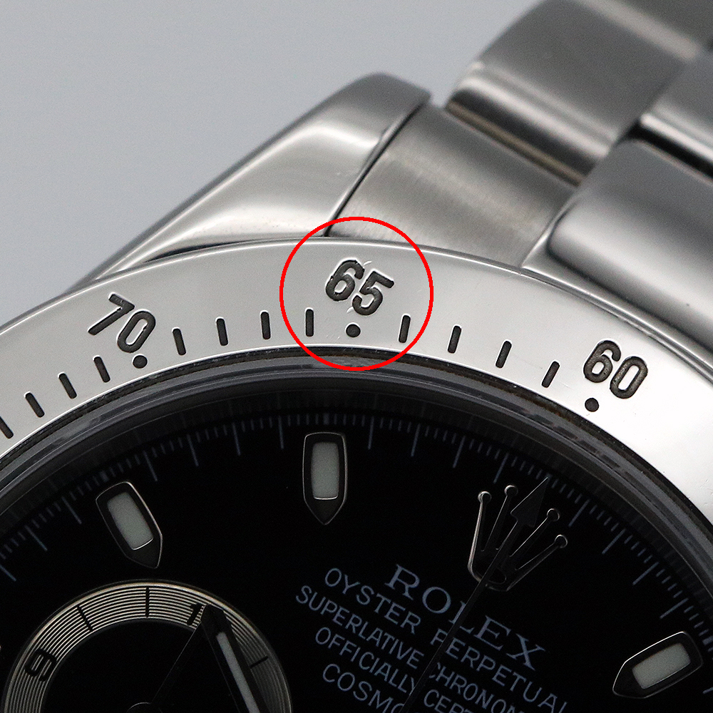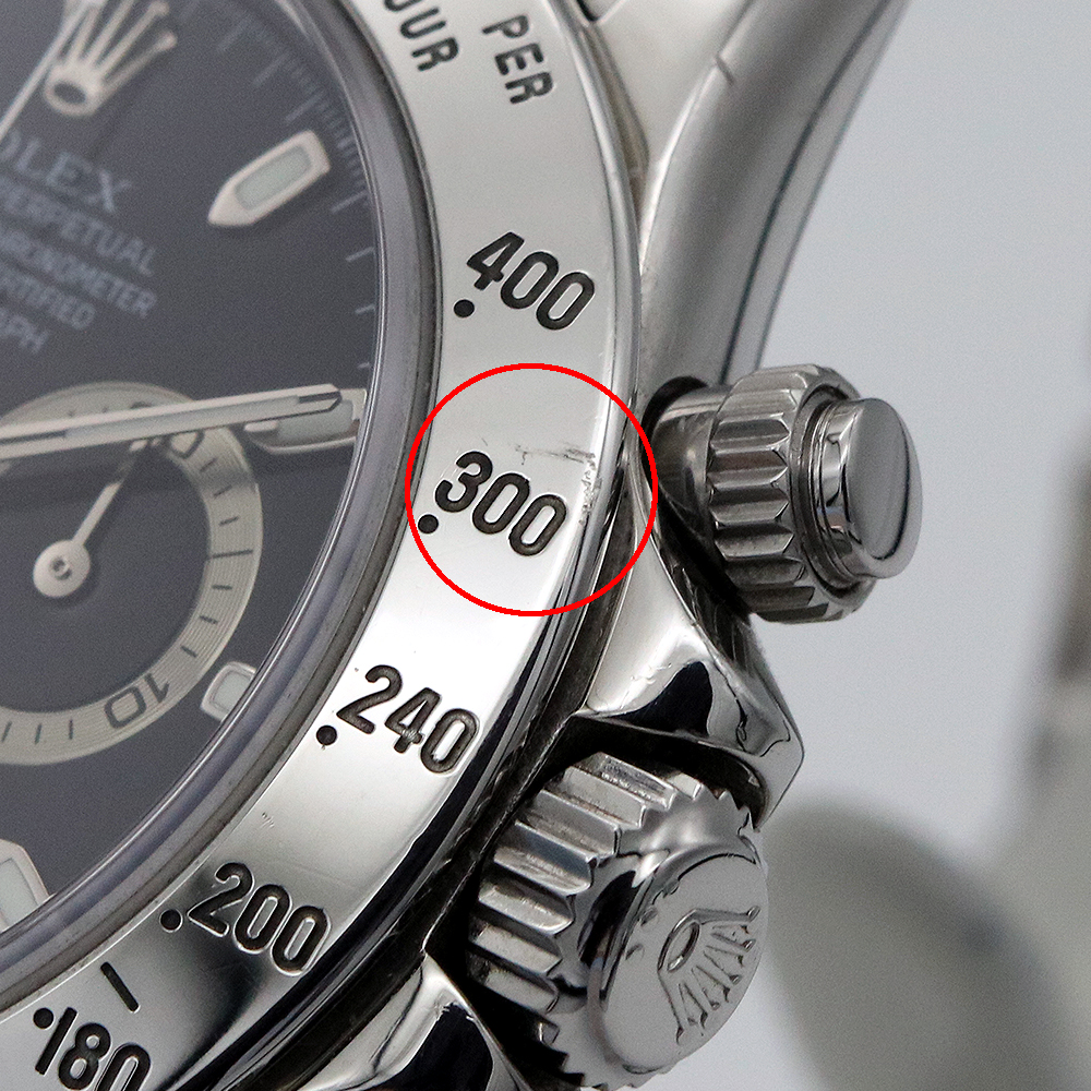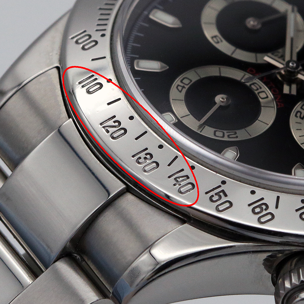 タキメーターベゼルの黒塗料がやや薄い部分があります。