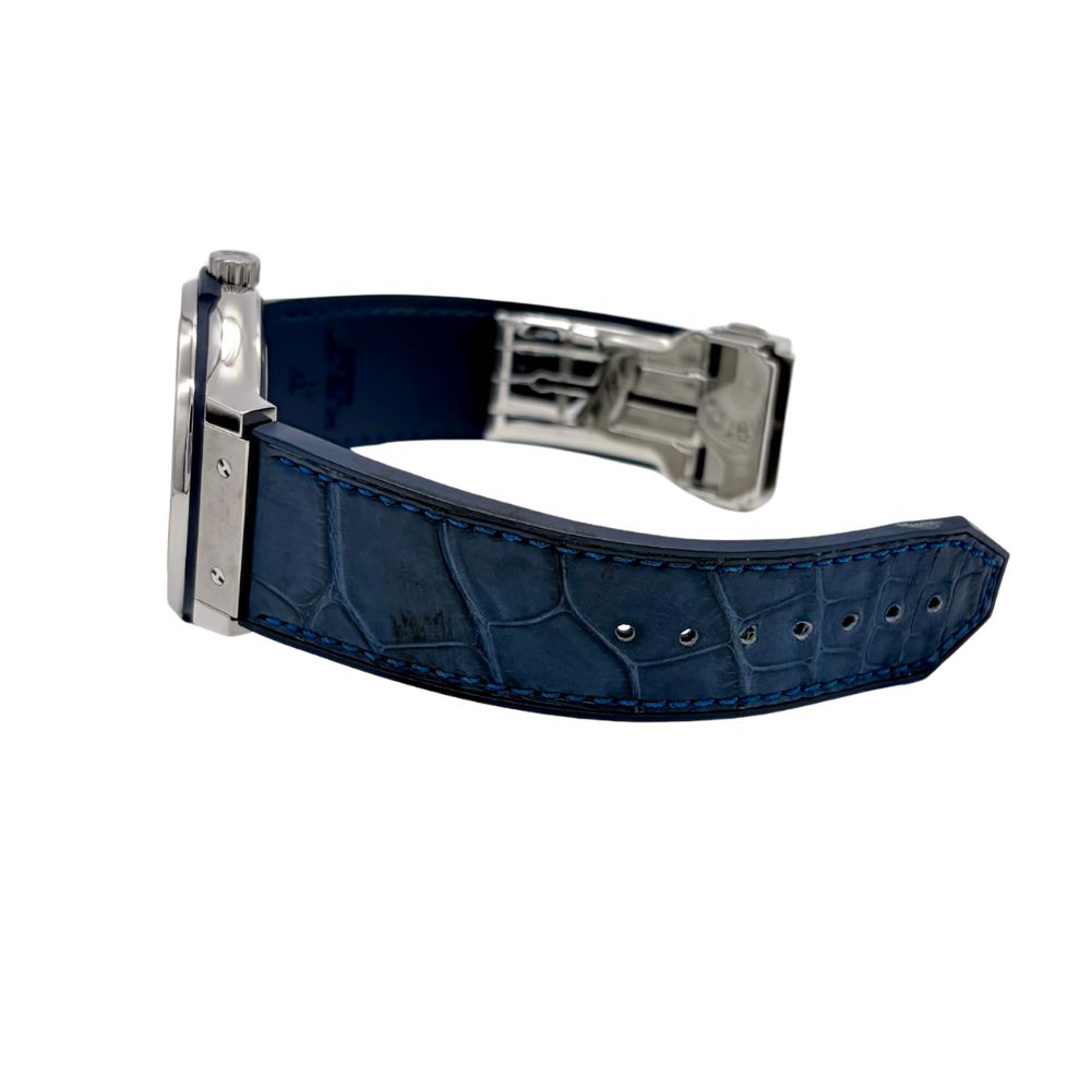 光の角度で微妙に変化する深みある色合いのサンレイ仕上げブルー文字盤と、サテン&ポリッシュの仕上げのチタニウムケースが、落ち着いた高級感を演出します。