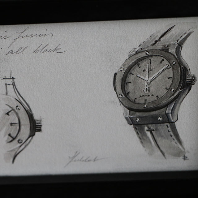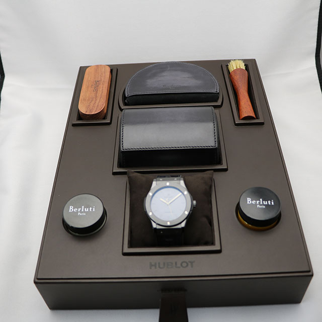 2016年世界限定500本モデル。サテン仕上げ&ポリッシュ仕上げのブラックセラミックケースに、ブラックラバー&ベルルッティパティーヌ染色のヴェネチアレザー“ガスパール”デザインストラップを使用。文字盤にも、同ヴェネチアレザーを使用。レザーのメンテナンスキットを収納できる専用ボックス付属。