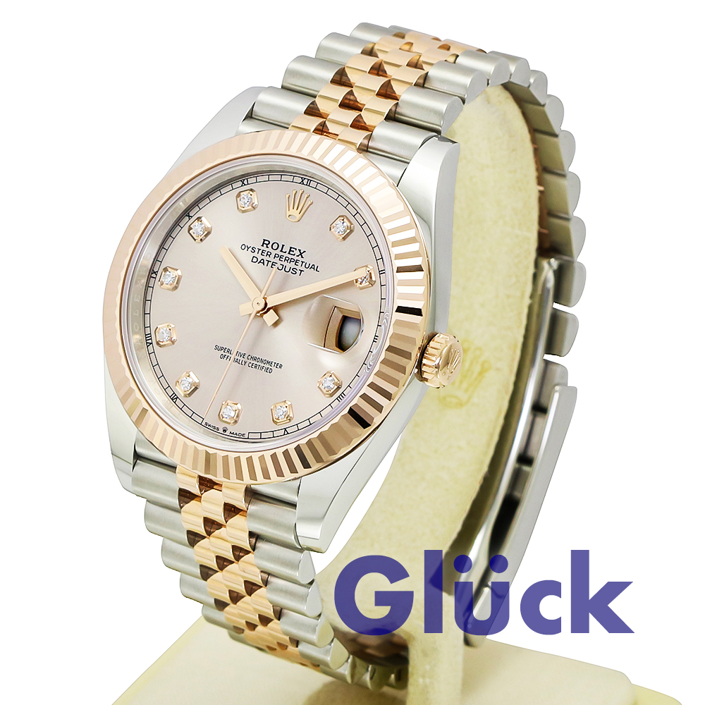 サンダスト、ダイヤモンド入り ダイアルとジュビリー(Jubilee)ブレスレットを備えた、オイスタースチール&エバーローズゴールドのオイスター パーペチュアル デイトジャスト 41 126331G、入荷いたしました。
