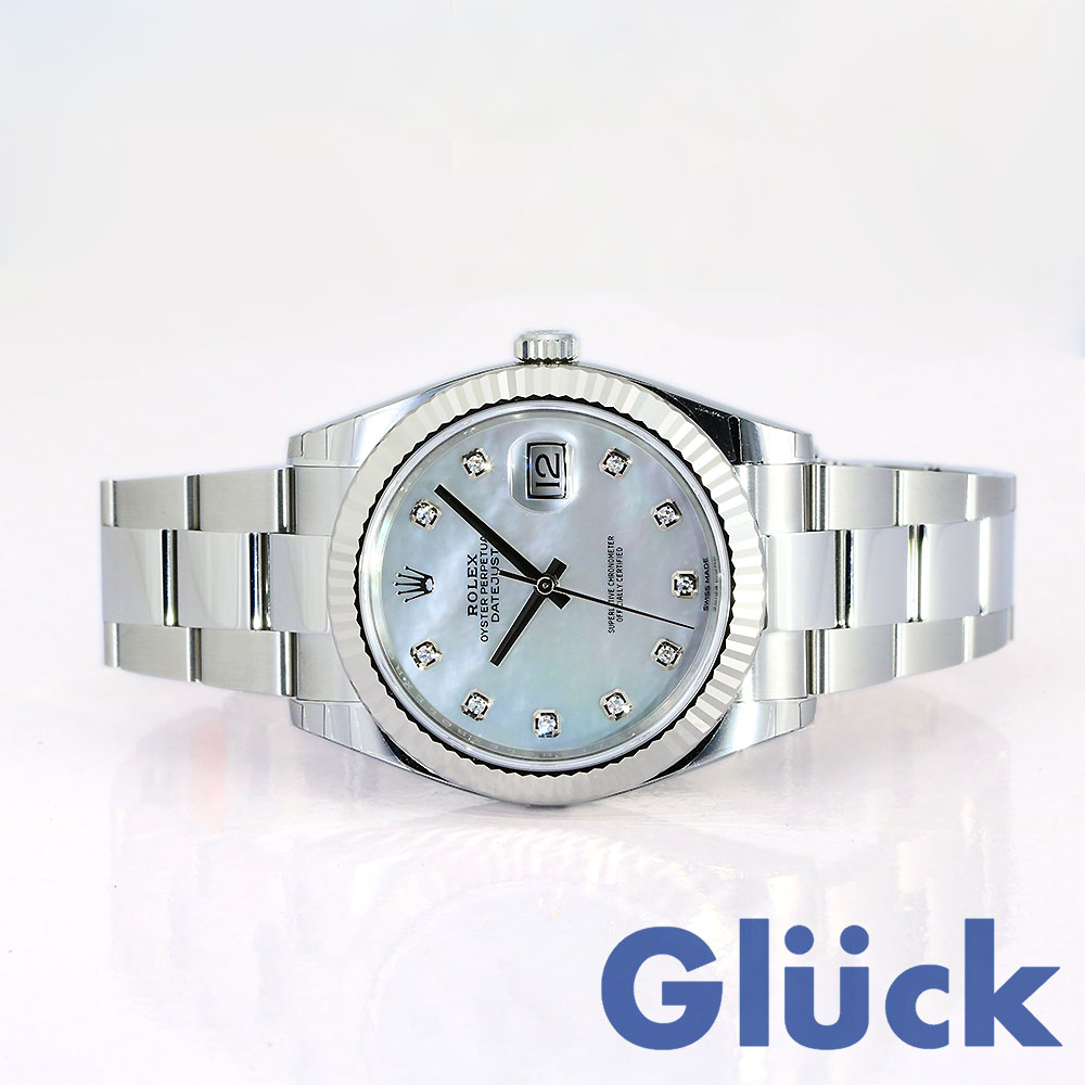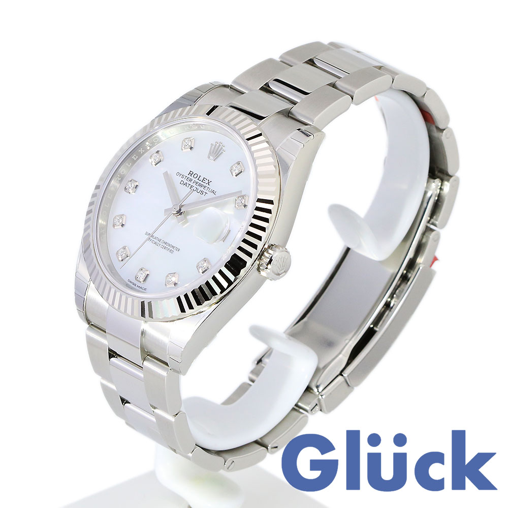 文字盤は、マザーオブパールに10ポイントダイヤです。ロレックスのマザーオブパールには人工的な着色は一切行われておらず、その自然の美しさのみを際立たせ、本来の色合いを保持しています。