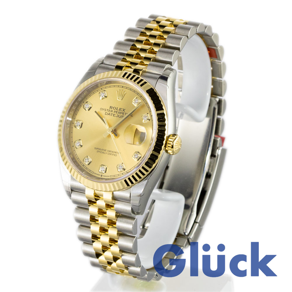文字盤は普遍的な人気を誇るシャンパン/10ポイントダイヤになります。