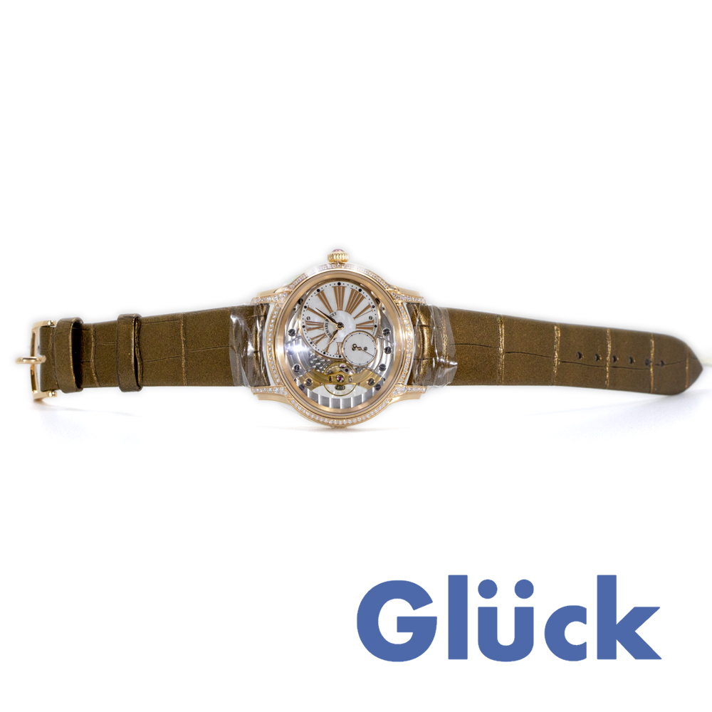 こちらはケース径39.5mmのレディースモデルとなり、ピンクゴールドケースにはダイヤセッティングされております。