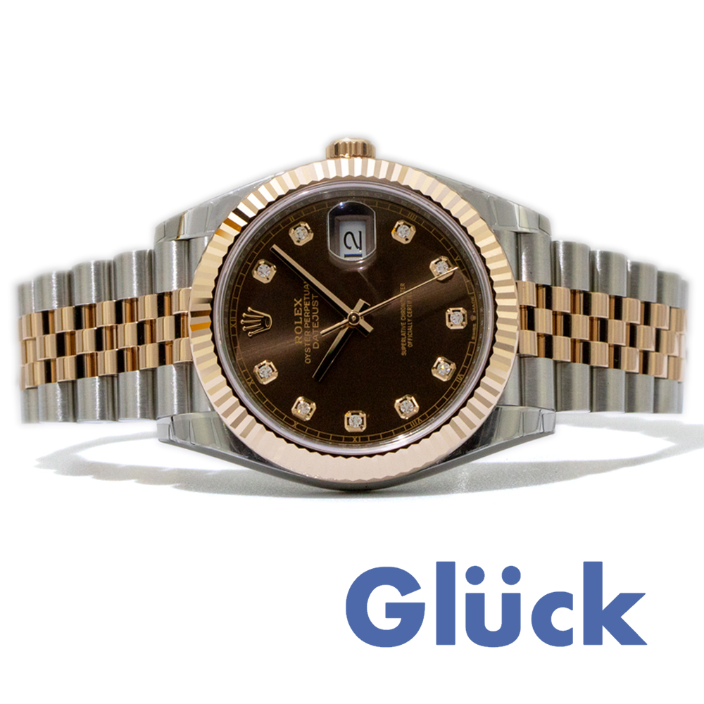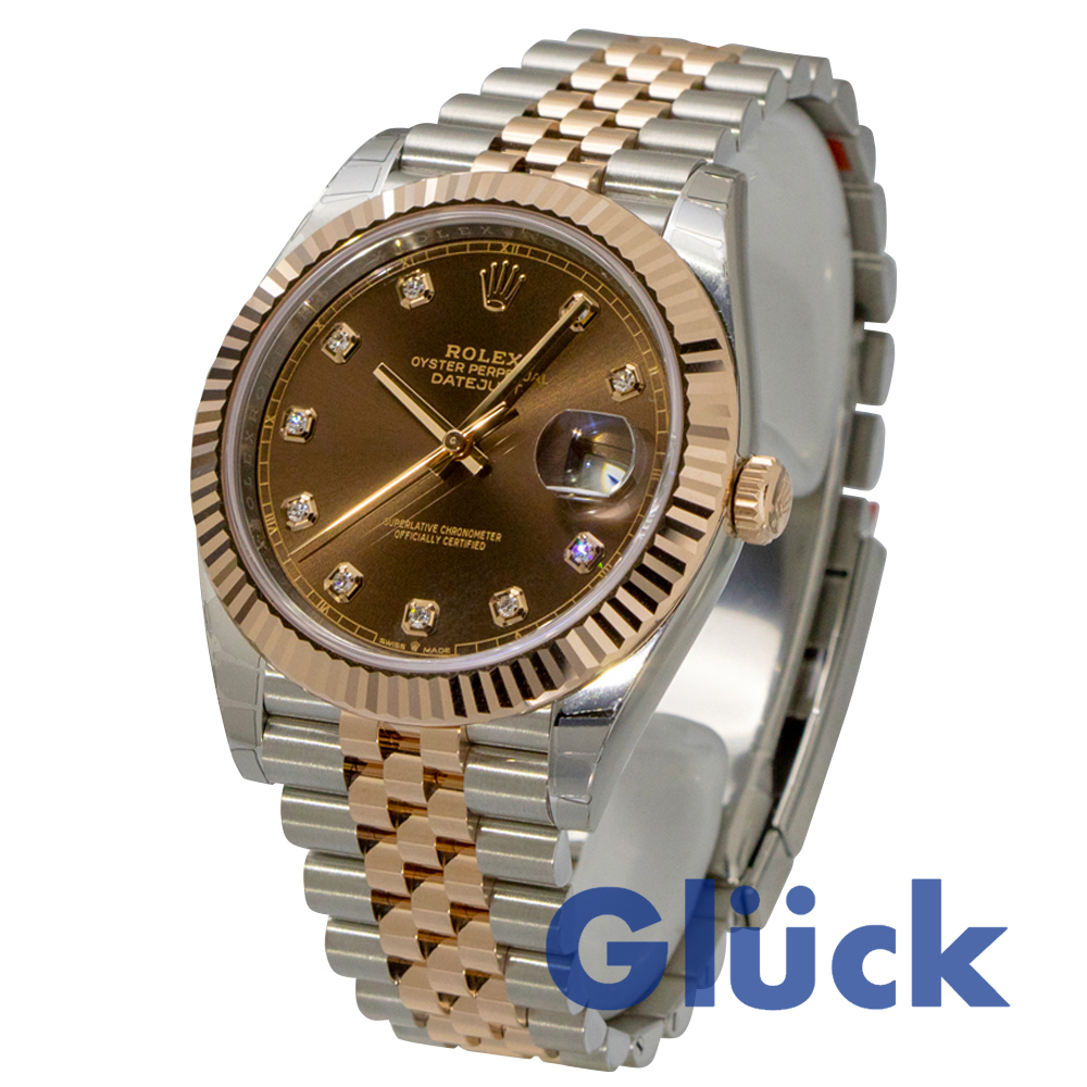 ロレックス独自のRG「エバーローズゴールド」と904Lスチールのコンビ”ロレゾールにチョコレートダイヤルに10Pダイヤをあしらったエレガントなモデルです。