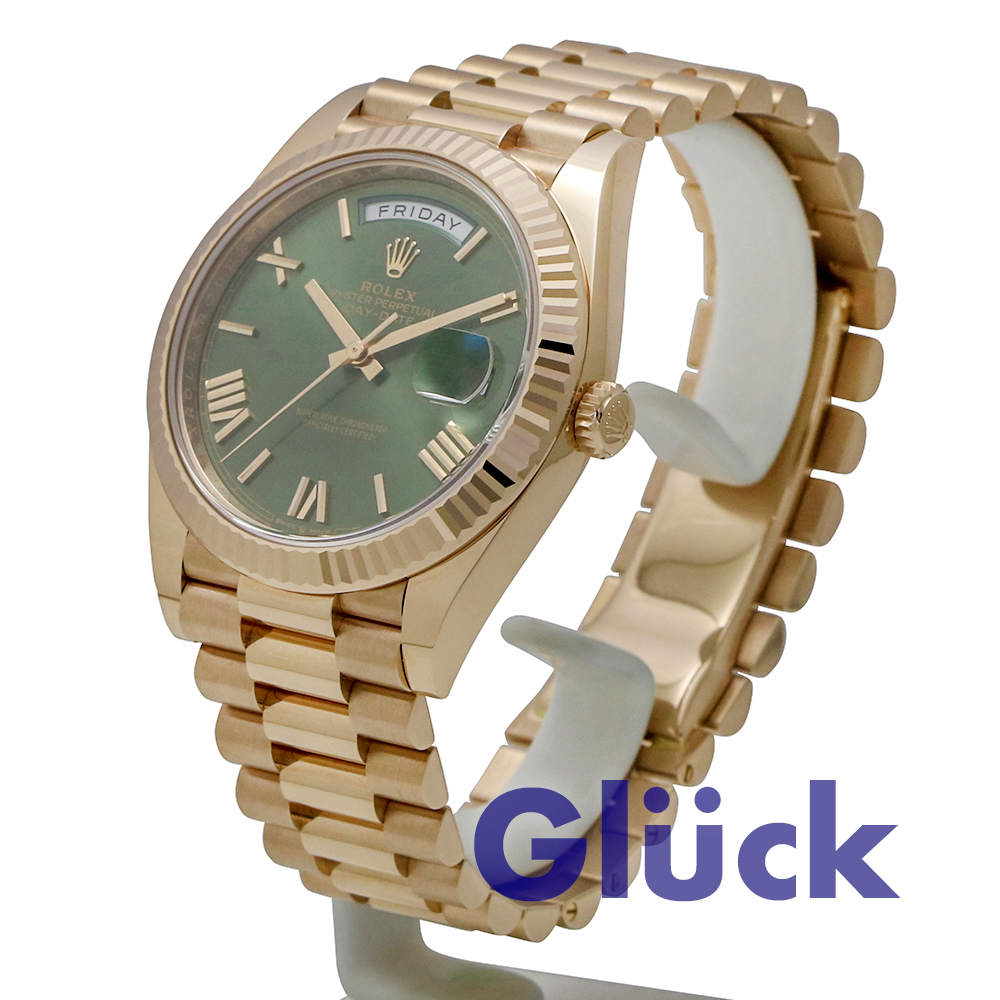 オリーブグリーンダイアル、フルーテッドベゼルとプレジデント(President)ブレスレットを備えた、18ctエバーローズゴールドのオイスター パーペチュアル デイデイト 40、入荷いたしました。